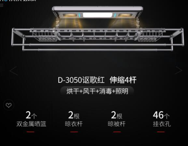 这款晾衣架的优点有很多,比较有特色的就是衣被同晾功能,·其次就是伸缩晾杆,承重能力比较大,并且带有3D广角照明!