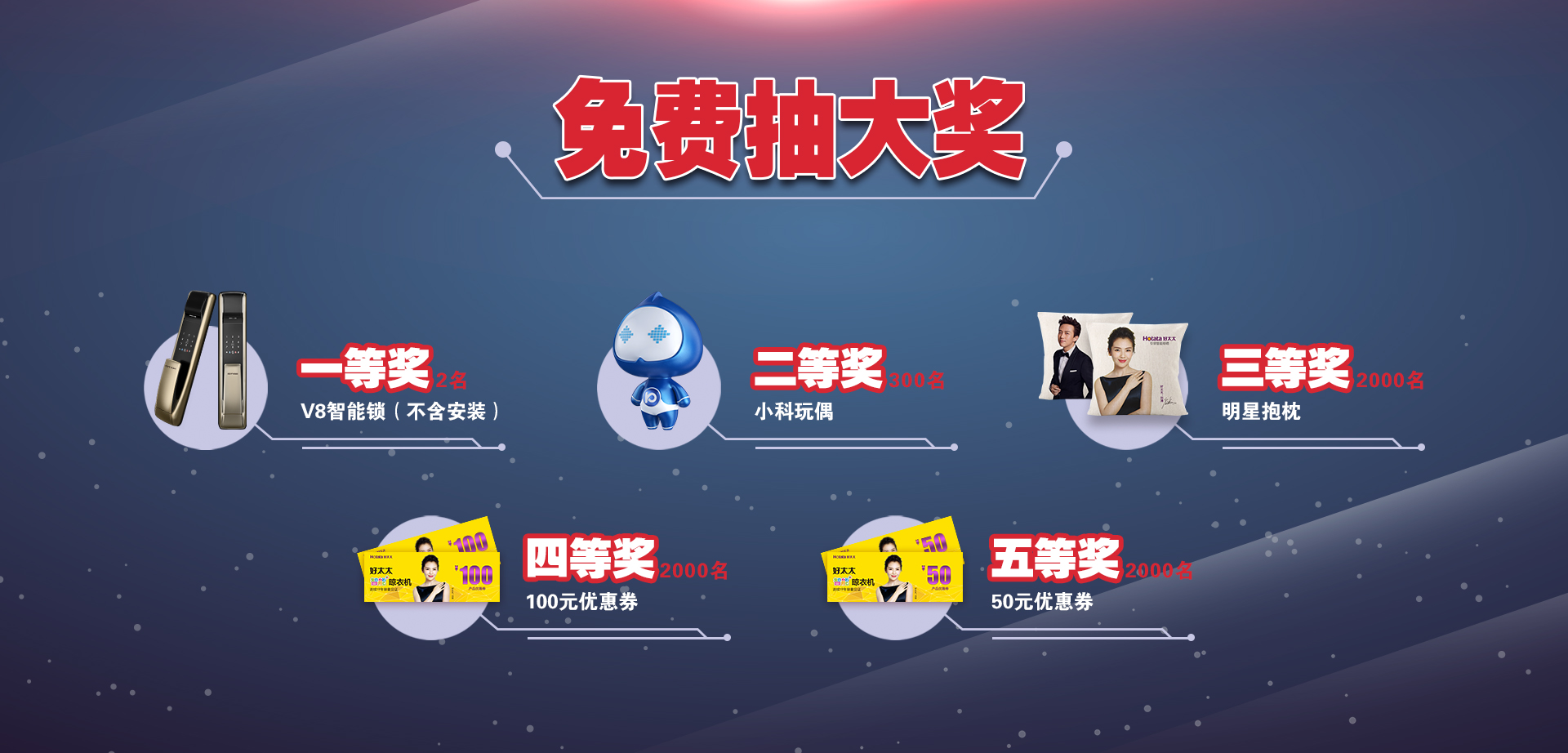 每日可免费抽奖一次,价值2998元的科徕尼高铁专列版V8、明星抱枕、小科玩偶、100元/50元优惠券天天送。