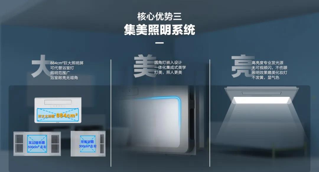 巨灵神三防电机,防水防潮防腐蚀;鲸吸3换气技术,卫生间无窗也能时刻清新;还有集美照明系统,三大核心优势,令大家又多了一个理由选择乐鱼智能浴霸!