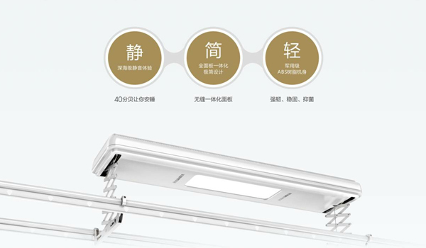 智静系列技术升级,40分贝超静音电机,即便深夜使用,晾衣机运行仍静默无声,带来深海级静音享受。忙碌的工作后,静谧的温馨时刻,这一刻,静静感受。